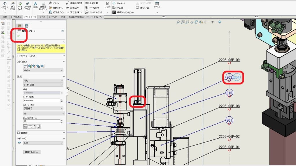 3.次にバルーンの積重ねをしたい部品を選択します。すると積重ねバルーンが表示されます。チェックマークをクリックし、コマンドを終了します。