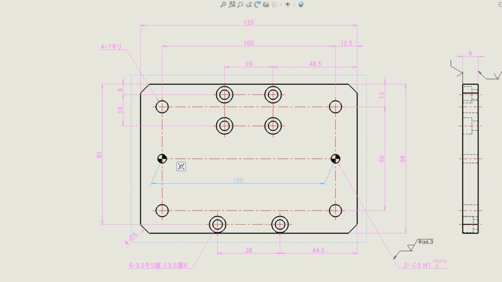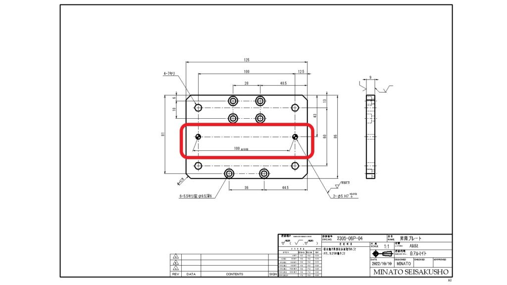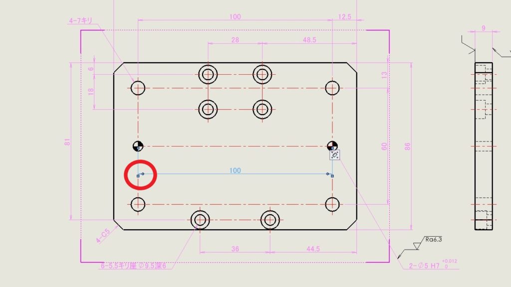 寸法補助線を傾けて位置決め穴のピッチのみに公差を入れる