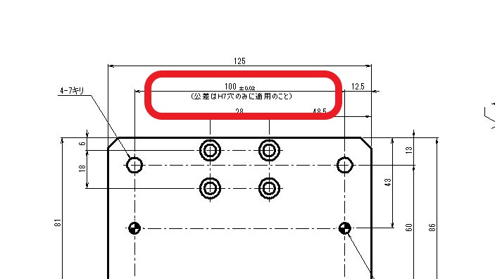 1.シリンダ等の取付プレートで、キリ穴と位置決め穴のピッチが同じだけど、公差が欲しいのは位置決め穴のみの場合ということがよくあります。そういう時は下図のように公差を入れたい穴のピッチの寸法を傾けて公差をいれます。