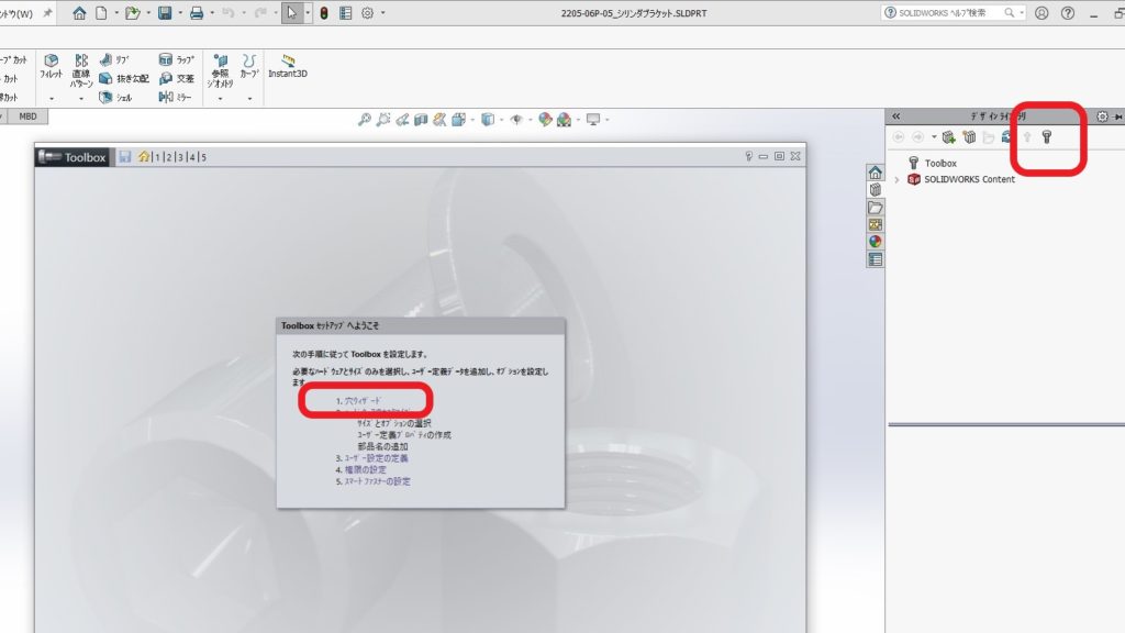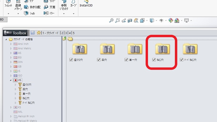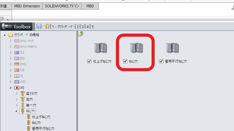2.まず「Toolboxコンフィギュレーション設定」から「1.穴ウィザード」を選択します。