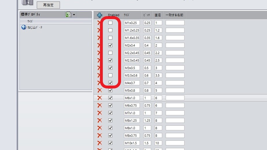7.ついでにもう一度「サイズ」をクリックし、使用することのないサイズのチェックを外しておくと「穴ウィザード」での選択から表示されなくなります。