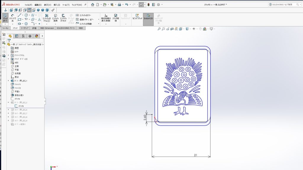 5.複雑な絵柄の場合、上手くカットすることができないので、一度絵柄を押し出します。押し出す理由は、カットする絵柄のスケッチをする際、「エンティティ変換」を使用するためです。