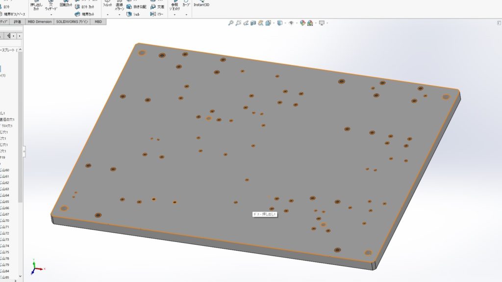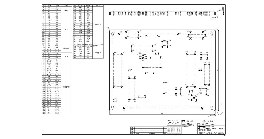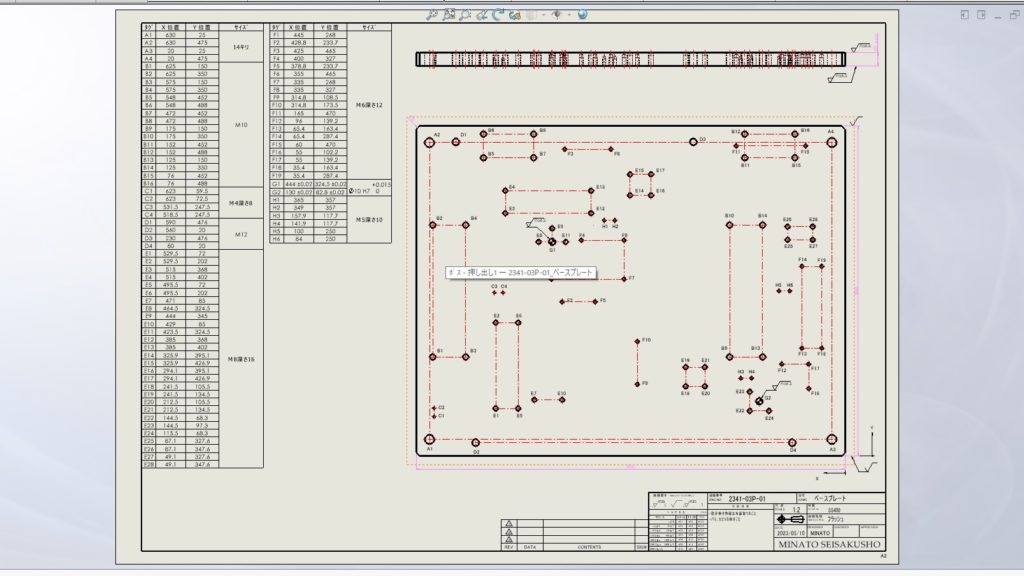 2.下図のようなベースプレート部品で寸法を入れるには穴テーブルを使用した方が圧倒的に早く部品図を作図することができます。