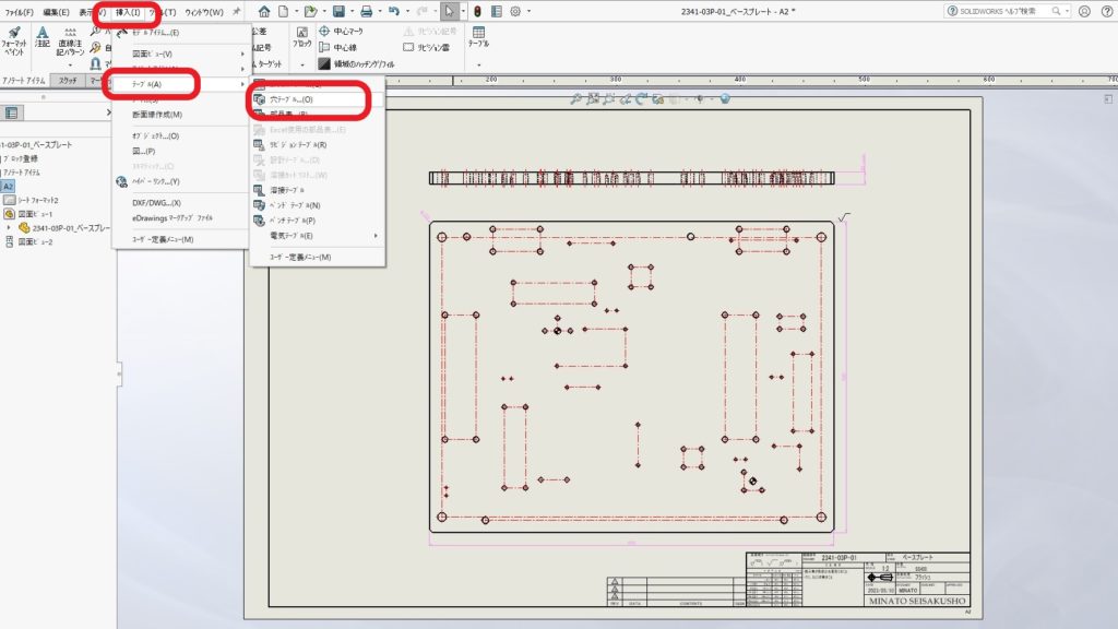1.ベースプレート部品等の部品図で穴テーブルを使用しての作図の方法を紹介します。