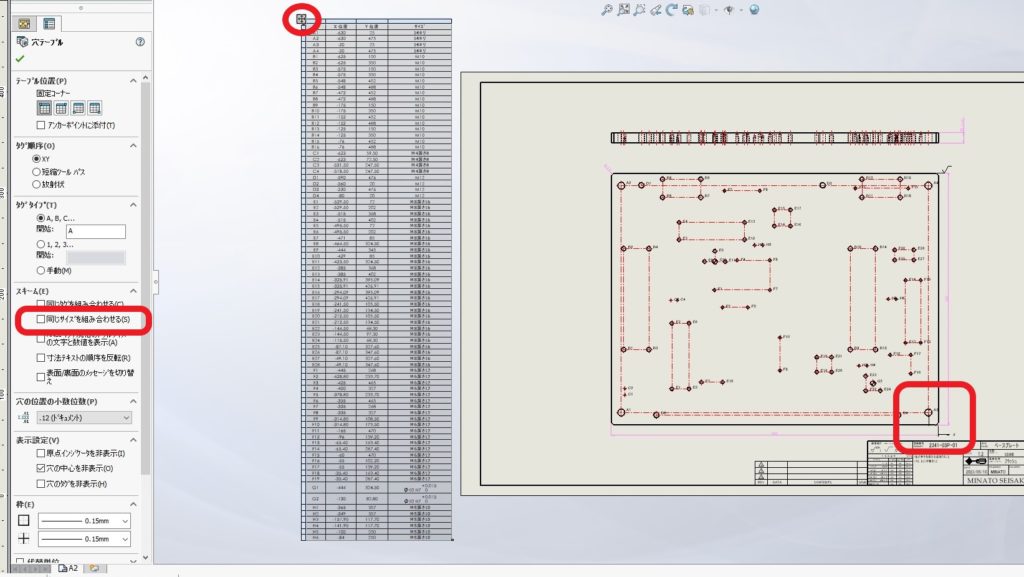 5.穴テーブルが表示されますので、ここから表示を整えていきます。まず穴テーブルの左上の十字矢印をクリックすると穴テーブルのダイアログが表示されます。「スキーム」項目の「同じサイズを組み合わせる」にチェックします。データムをクリックし位置・方向をを整えます。