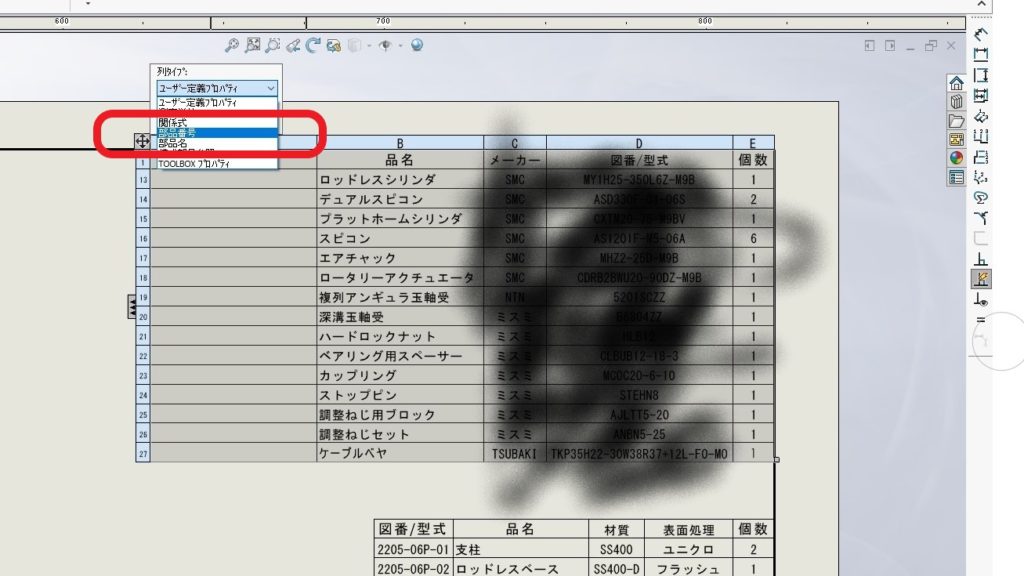 7.後は列タイプの文字列を任意の「品番」等任意の文字列に変更します。このやり方だと部品のファイルプロパティに値を入力しておく必要も無く、同じ市販品ファイルを別々のモデルで使用することができます。
