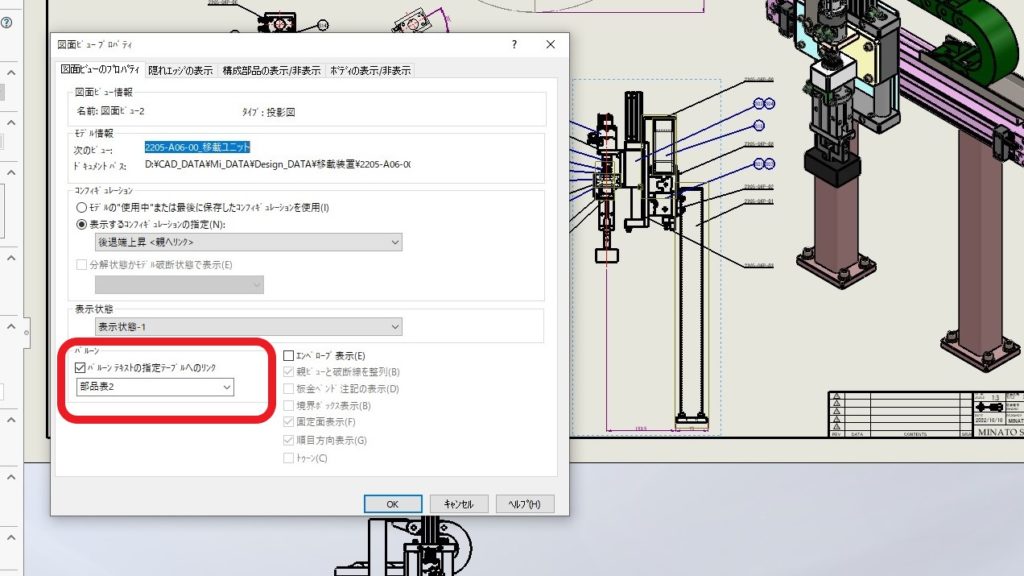 3.それから図面ビューのプロパティで「バルーン」項目の「バルーンテキストの指定テーブルへのリンク」にチェックを付けリンクする部品表を選択します。