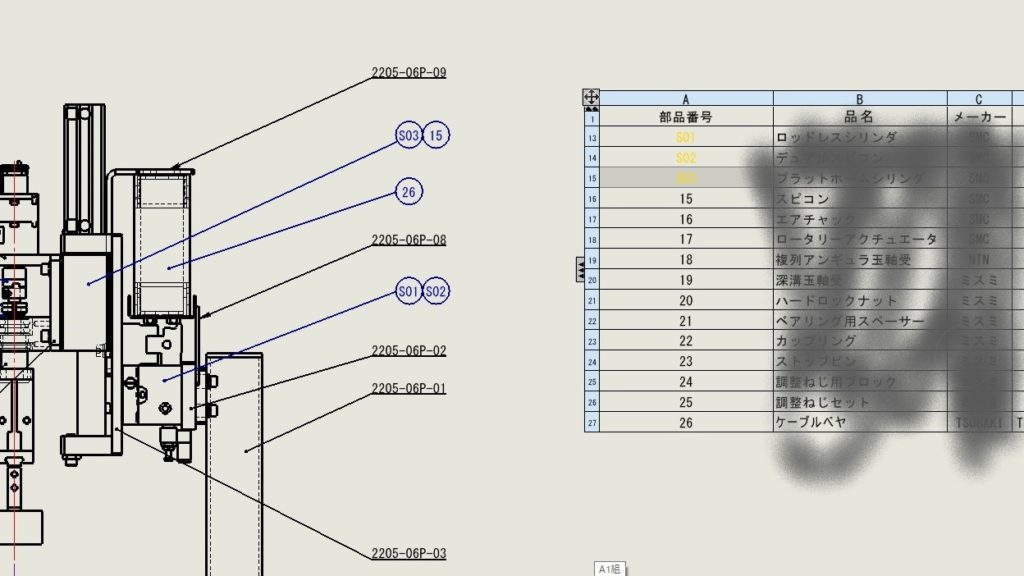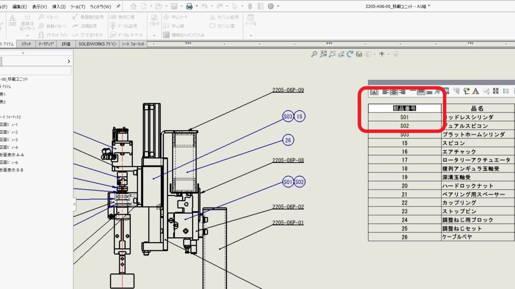 6.部品表の「部品番号」の列の値をとバルーンの値がリンクされ、列の値を変更するとバルーンの値も変更されます。