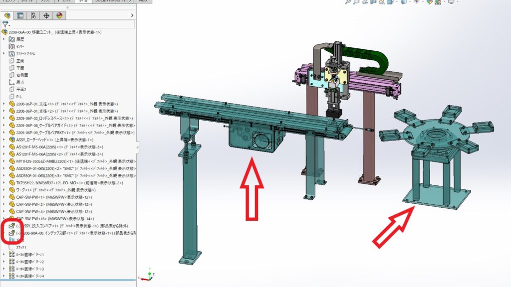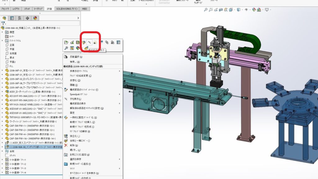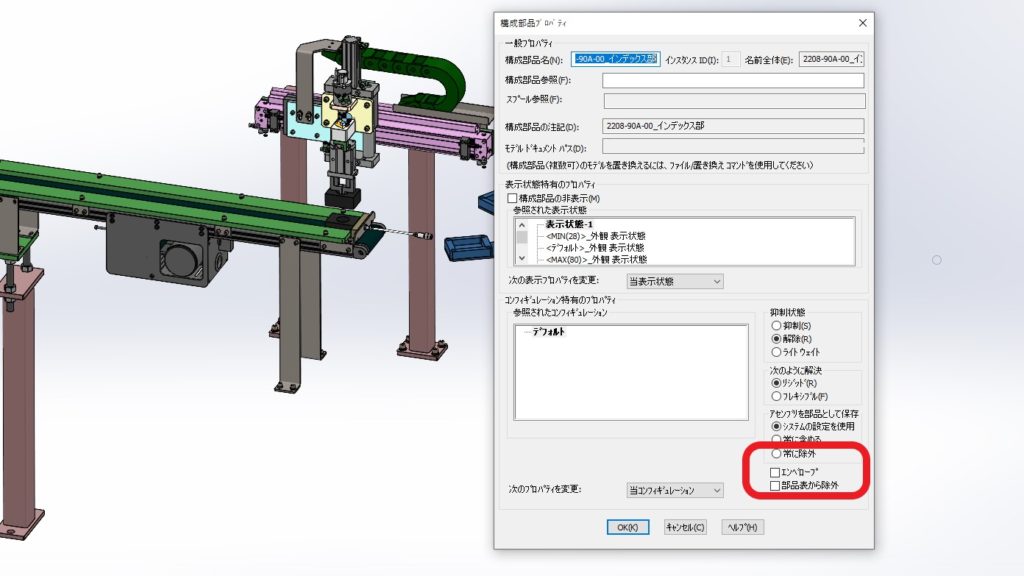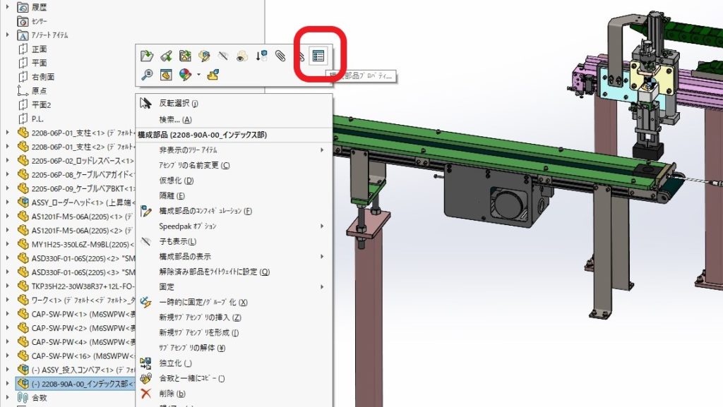 1.エンベロープを挿入部品・アセンブリに設定すれば、他ユニットをレイアウト部品として使用することができます。設定のやり方はエンベロープを設定したい部品を挿入し「右クリック」→「構成部品プロパティ」を選択します。