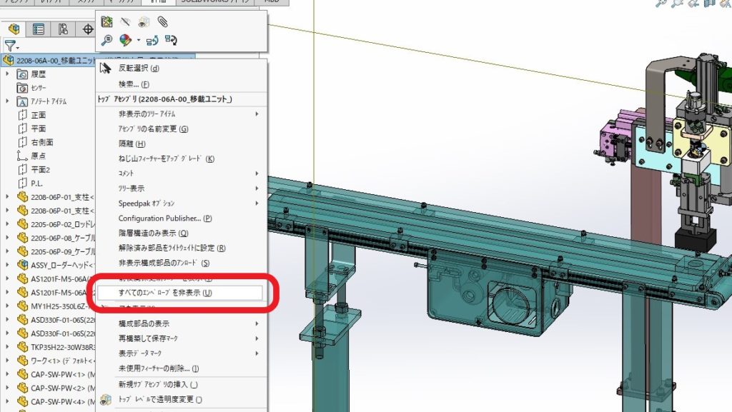 7.「トップアセンブリを右クリック」→「すべてのエンベロープを非表示」を選択することによってエンベロープを非表示にすることができます。