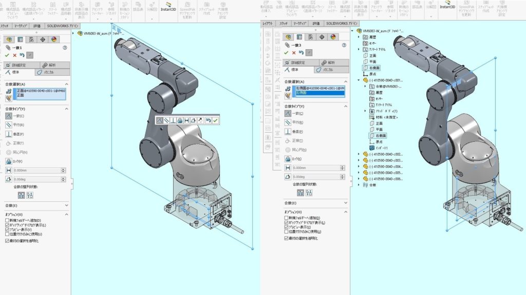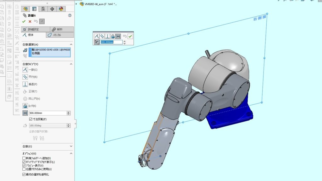 6.6軸目とアセンブリの正面・平面・右側面と距離で拘束を追加します。ハンドの位置や姿勢によって都度、拘束の種類を追加してみてください。