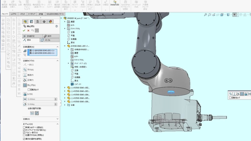 4.それぞれの軸を位置関係に注意して合致拘束します。可動範囲に動かしたいため、回転方向はフリーにしておきます。