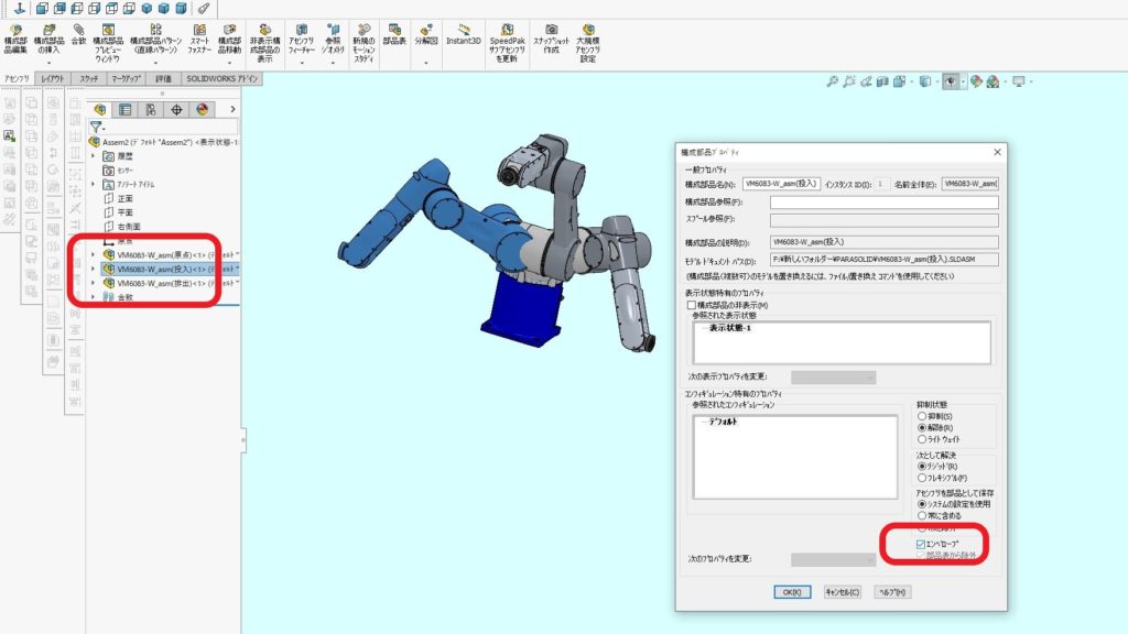 7.ロボットはポジション毎に名前を変えて保存した方が都合が良いです。原点のアセンブリ以外はエンベロープにしておきます。エンベロープにすることによって、部品表に表示されなくなったり、一括ですべてのエンベロープを非表示に設定できたり、扱いが楽になります。