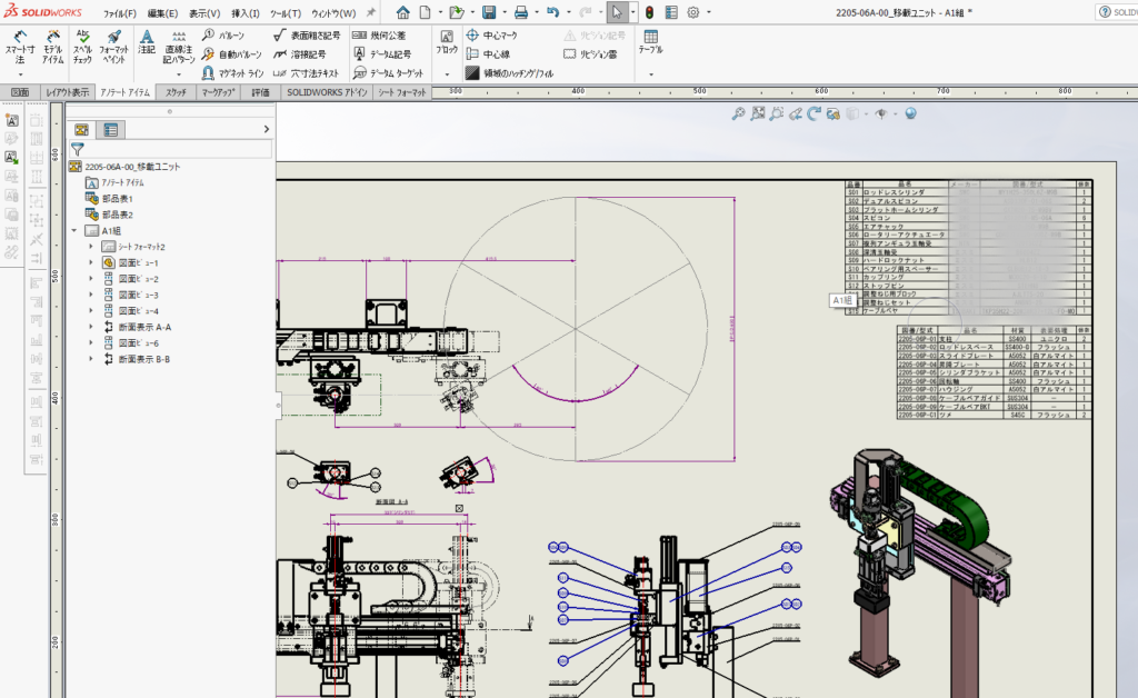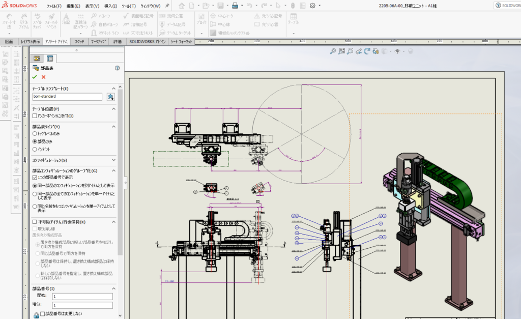 1.SOLIDWORKSでは組図上に部品リストを表示させるのが一般的かと思います。下図のような部品表の表示方法を説明します。