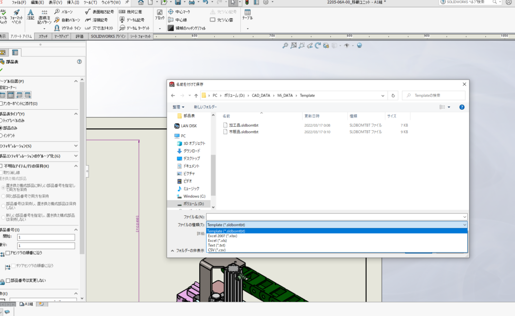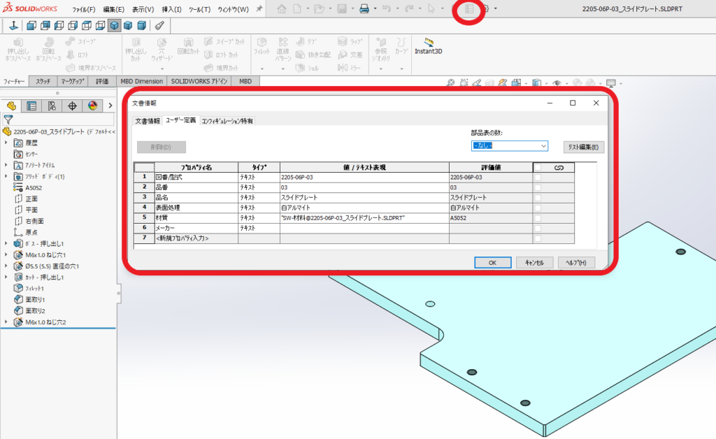2.まず始めに、各部品のファイルプロパティを設定します。弊社ではこのようなテンプレートを加工品・市販品共通として使用しています。