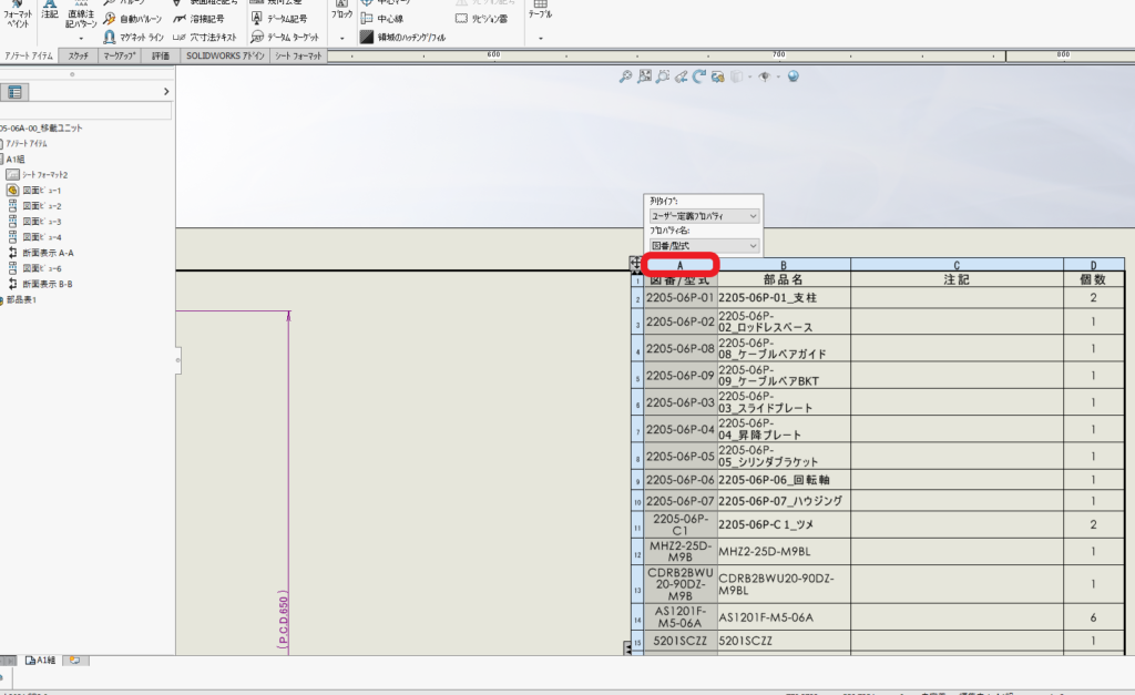 5.部品表がひょうじされたら列番号のアルファベットの部分をダブルクリックし、列の表示値を変更します。ファイルプロパティで入力した値を表示させるには「列タイプ」を「ユーザー定義プロパティ」を選択し「プロパティ名」を選択します。