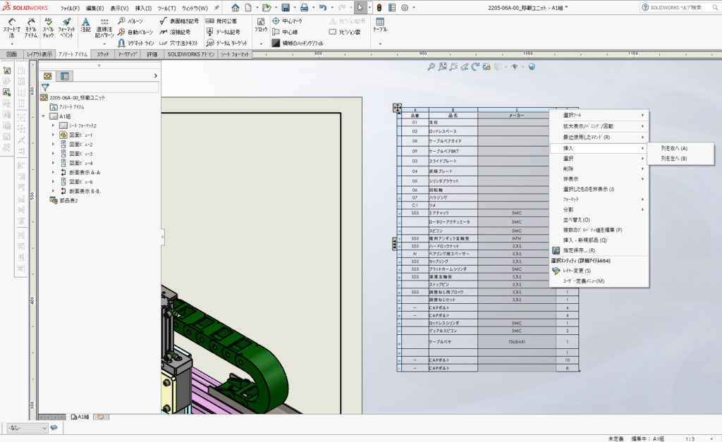 3.ツールバーから「挿入」→「テーブル」→「部品表」を選択し、部品表にするモデルのビューをクリックします。