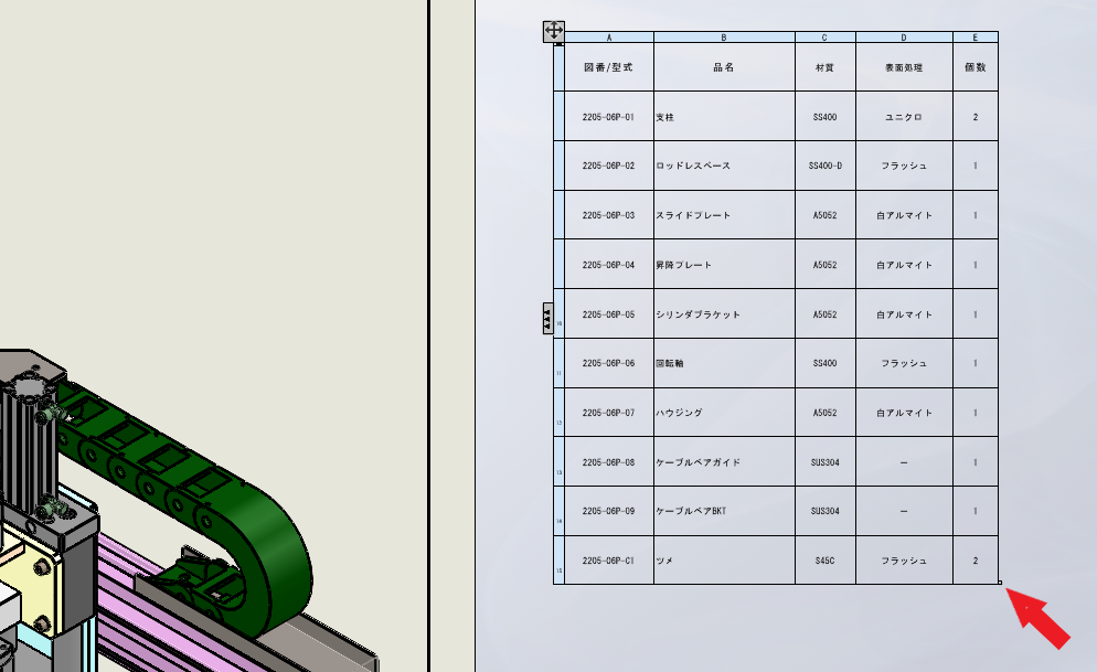 8.テーブル左上の十字矢印をクリックすると部品表の設定を変更することができます。「テーブル位置」で固定コーナーを選択できます。